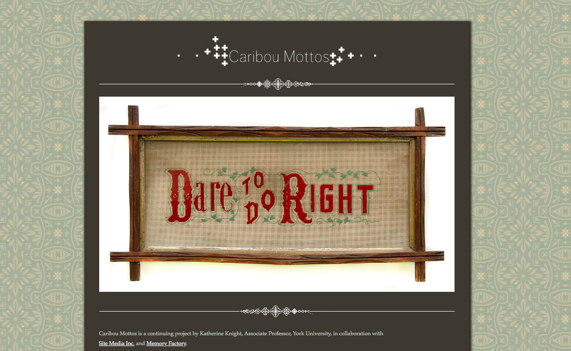 Caribou Mottos is a project by Professor Katherine Knight, York University that explores a collection of Victorian era punched paper pattern needlepoint mottos collected in Caribou, Pictou County, Nova Scotia. This site documents each piece in the collection accompanied by interpretive essays and other contextualizing information.